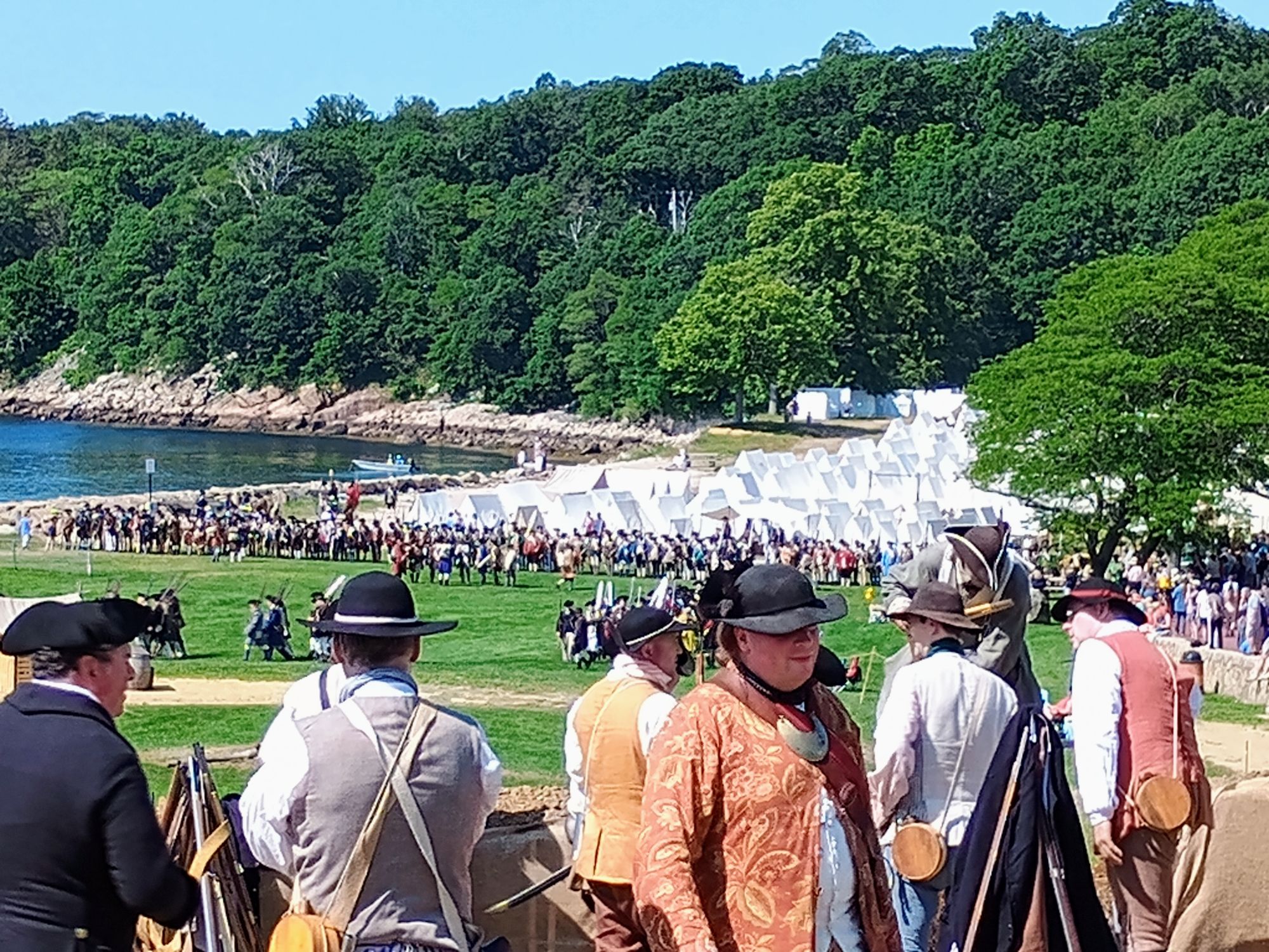 At the top of the hill was the “redoubt”, a kind of high foxhole made of bales of hay covered with dirt. That is where the Massachusetts troops were. So this is where my James would have been. The NH men were stationed on the side rail-fence down by the beach. This would have been where Jude was. (I saw a Black man in colonial garb there and I asked him who he was portraying. He replied “Prince Whipple”. Not Jude, too bad.)
