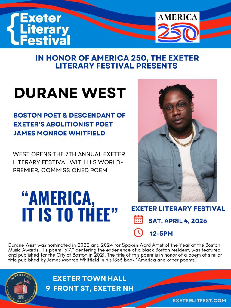 Boston poet Durane West will open the 7th annual Exeter Literary Festival with a reading of his commissioned poem, “America, it is to thee,” in honor of the America 250 anniversary. The poem serves as a contemporary bridge to our shared history, offering a modern perspective on the nation’s 250-year journey.